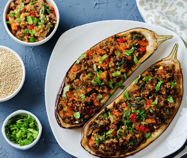 Forgo the carb heavy option and enjoy a nutritious Eggplant Stuffed with Lamb.