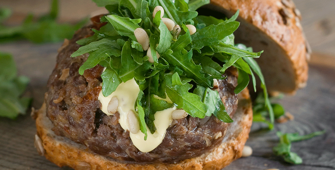 - Place each burger on the bottom half of a bun and top with the sauce and arugula. Serve burger with roasted sweet potato fries.