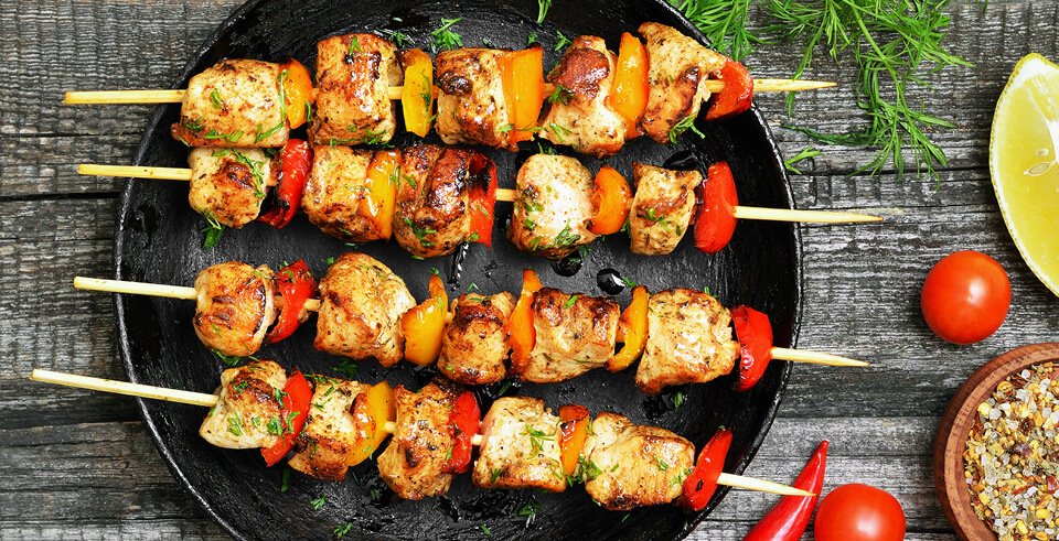 Serves 4. Per serving (4 kebabs): 275 calories, 9 g fat, 14 g carbohydrates, 5 g fiber, 33g protein