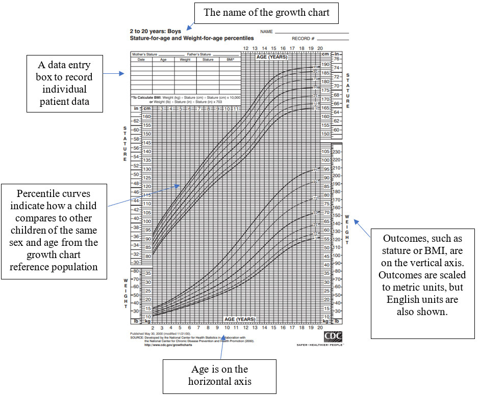 - The clinical growth charts display age on the horizontal x-axis and an outcome such as stature, weight, or BMI on the vertical y-axis.